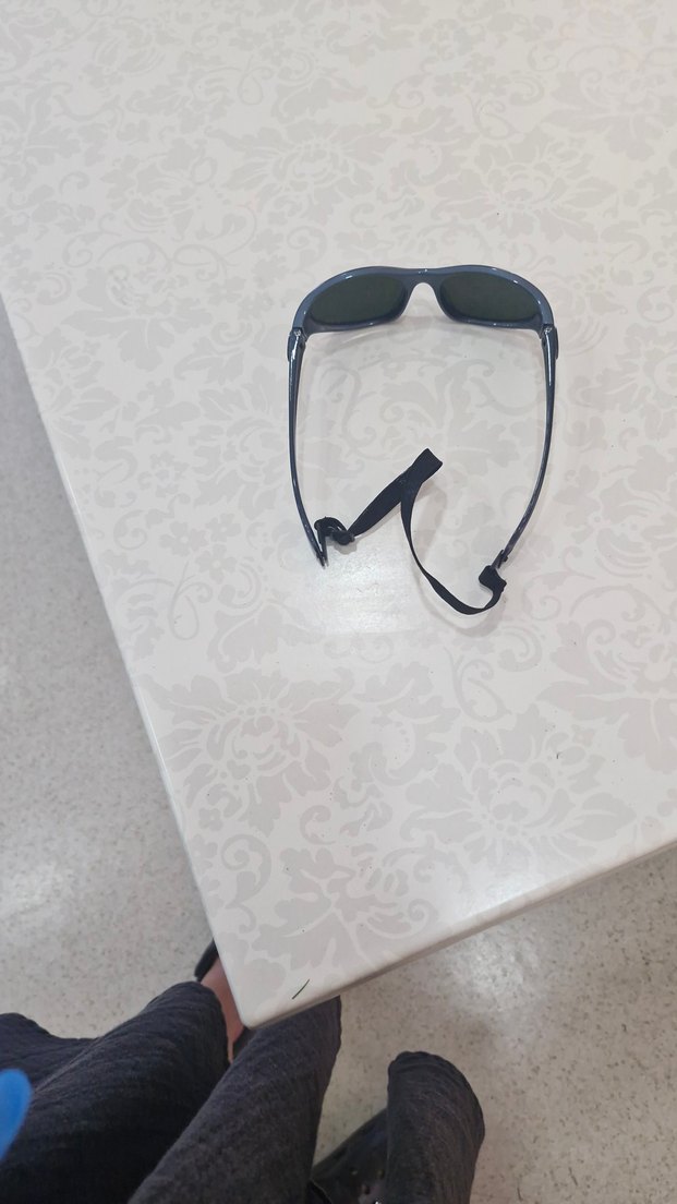 Gri camlı, mavi çerçeveli minimalist biker tarzı erkek güneş gözlüğü, aktif kullanım için ayarlanabilir kayışlı. Rock punk havasına uygun.