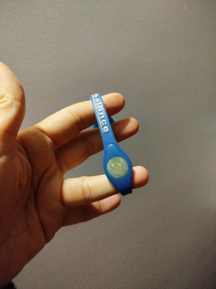 Mavi renkte, renkli tasarıma sahip bileklik. Kayışında 'balance' yazısı bulunur