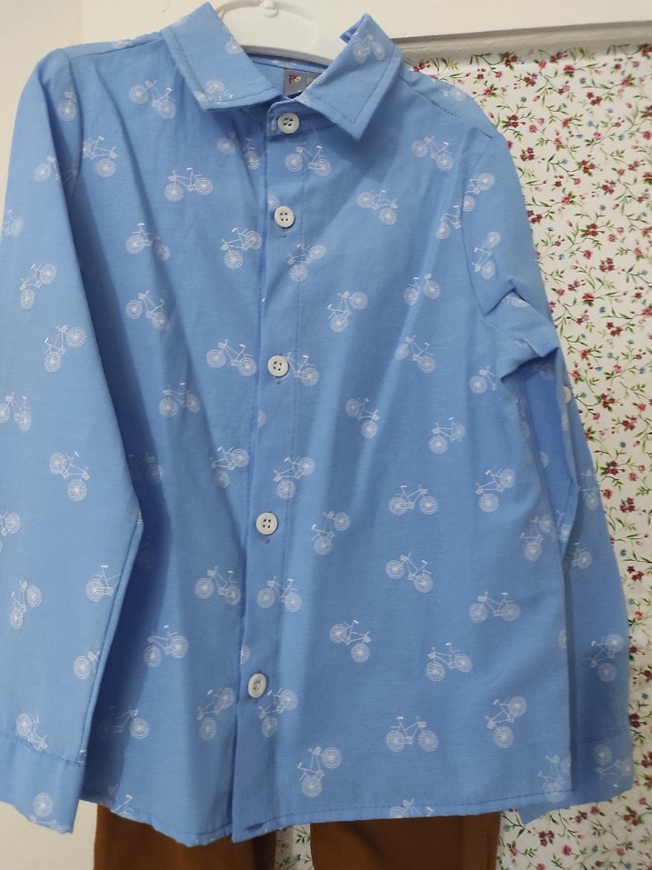 Uzun kollu, yakalı ve düğmeli erkek gömleği. bir kere tek giyildi Pamuklu, pastel mavi renkte bisiklet desenli, rahat kesim, sokak stiline uygun.
