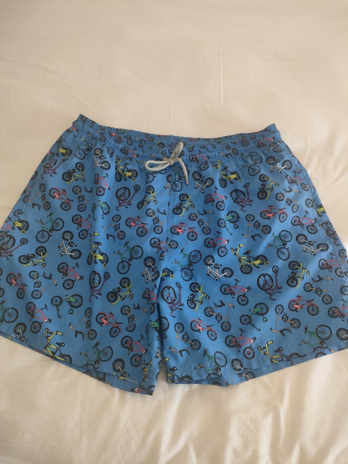 Renkli bisiklet desenli, bol kesim erkek mini şort. Kemer tokalı, kısa ve rahat, plaj için uygun bir tasarım.
