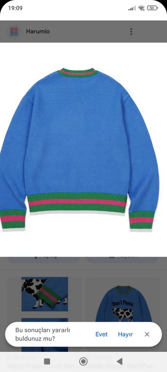 Mavi renkli, örgü kadın kazak, bisiklet yaka ve uzun kolludur. Yeşil ve pembe çizgili ribana manşet ve etek ucu bulunur. Salaş kesim ve normal boydadır.