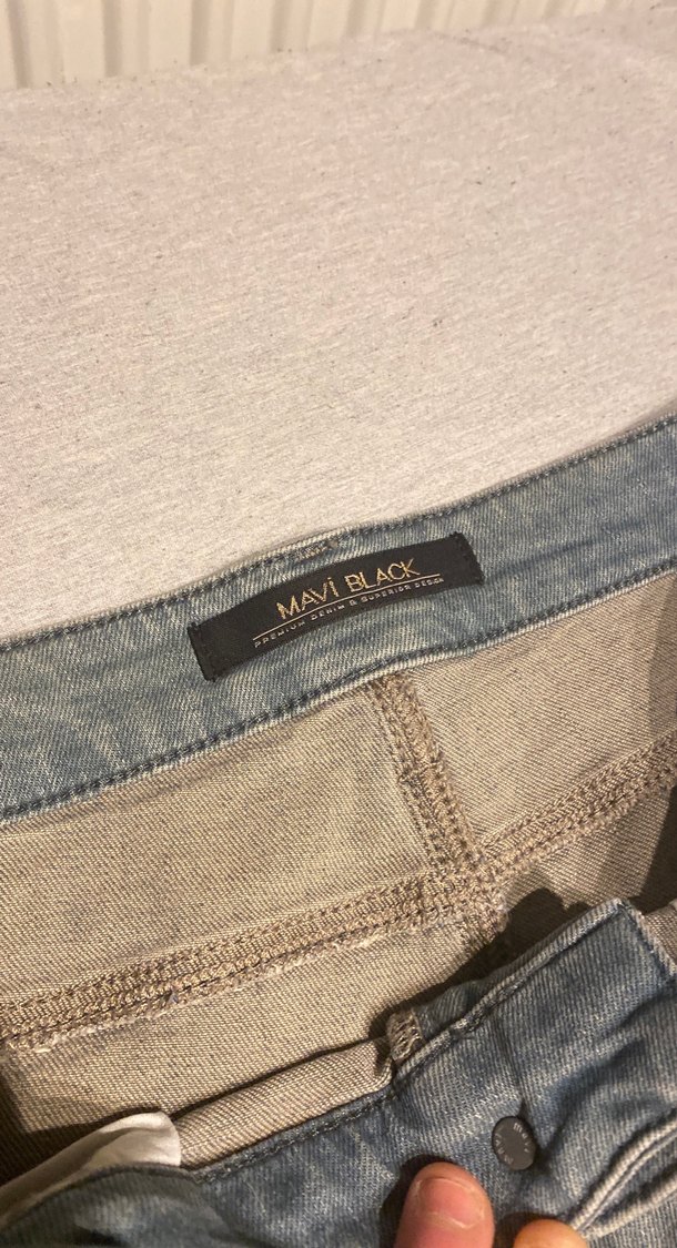 Mavi Black markalı, baskılı bej renkli, bol kesim ve tokalı erkek kot pantolon, rahat denim kumaştan üretilmiştir.