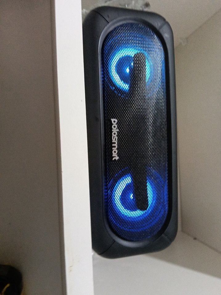 Koyu mavi Bluetooth hoparlör, çift aydınlatmalı sürücüler ve taşıma kolaylığı için ortada tutma sapı içerir. Kablosuz ses oynatma sağlar.