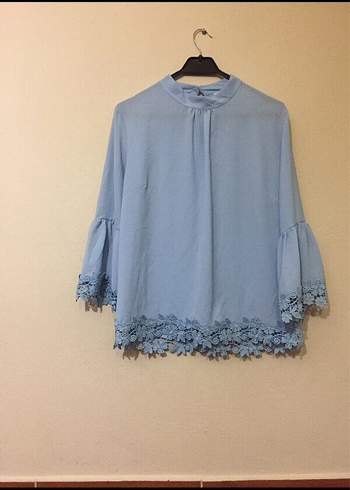 42 beden kolları ve etek kısmı dantelli bluz.1 kez giyildi yeniden farksız.iki kol altı 55 cm boy 60 cm kusursuz