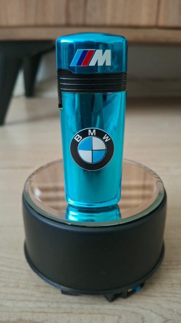 Parlak yüzeyli, BMW logosu ve M amblemi bulunan canlı mavi renkli çakmak. Koleksiyonluk hediye için uygun.