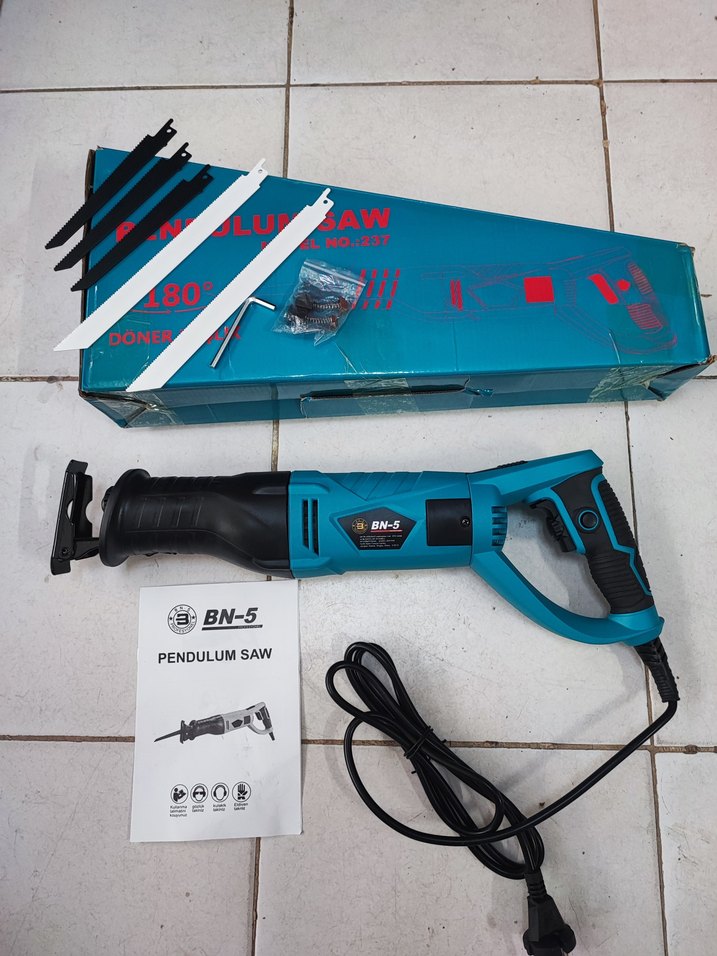 Mavi gövdeli BN-5 pendulum testere, konforlu tutma yeri, farklı testere bıçakları ve kullanım kılavuzu ile birlikte gelir. Hassas kesim için uygundur. 1100 watt 180 derece kesim yönünü ayarlayabilirsiniz devir ayarlı