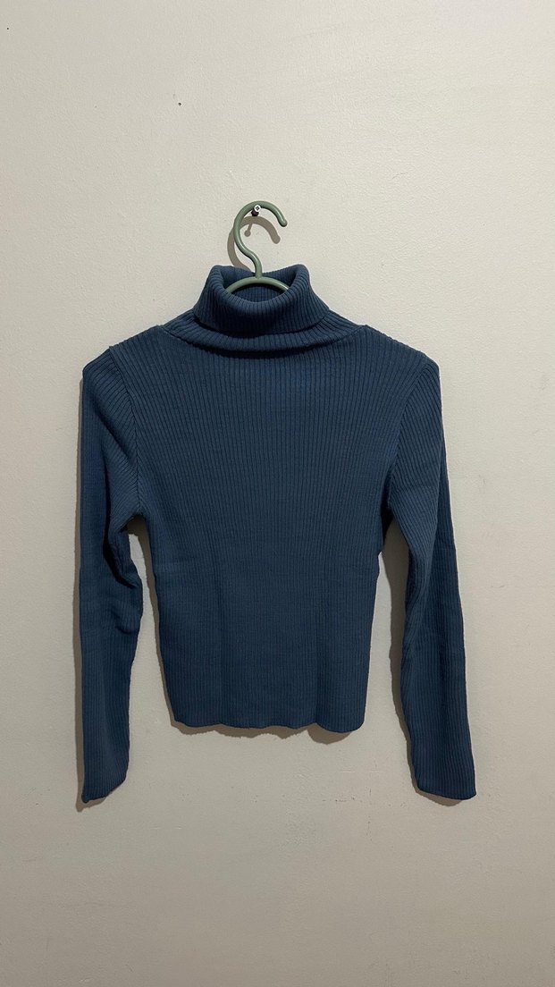 Boğazlı, uzun kollu ve ince triko kumaştan yapılmış, mavi renkte sade, vücuda oturan kadın kazak. Minimalist tarzda günlük kullanıma uygundur. Defosu yok. Bedeni olmuyor bana artık.