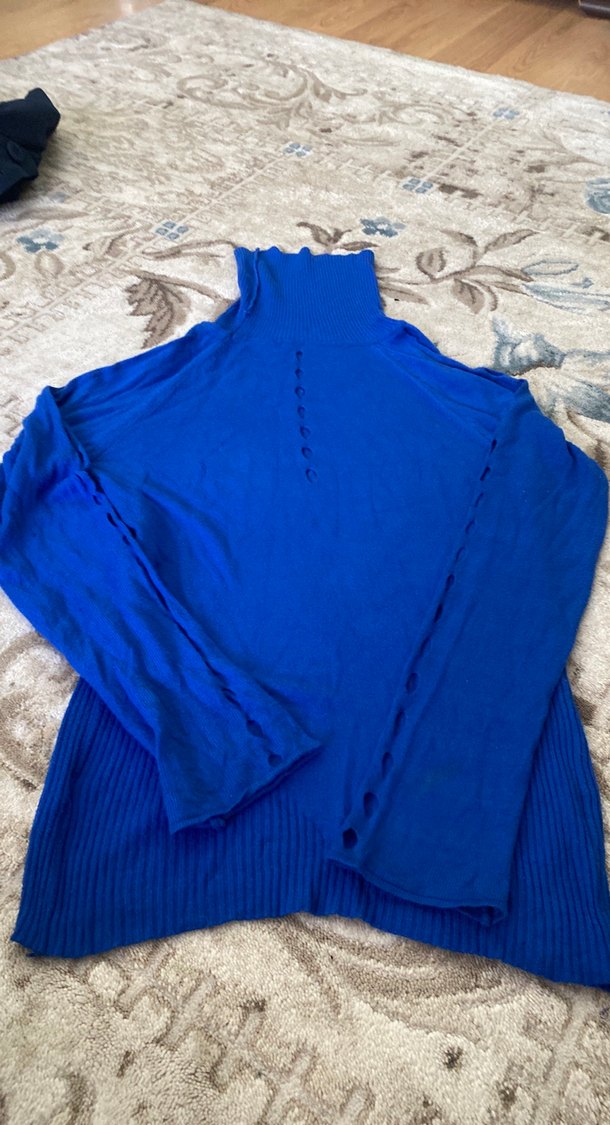 Mavi renkli, parlak görünümlü, balıkçı yaka ve uzun kollu kadın triko kazak. Rahat kesimli, midi boyda ve yumuşak keten kumaştan üretilmiştir. Günlük kullanıma uygun, konforlu normcore tarzı.