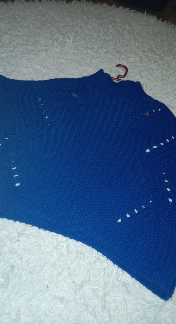 Mavi renkte, boğazlı ve uzun kollu, örgü dokulu kadın kazak. Rahat kesimi ve normal boyuyla dış mekan için uygundur. Desensiz ve rahat tarzda, sokak modasına uygun.