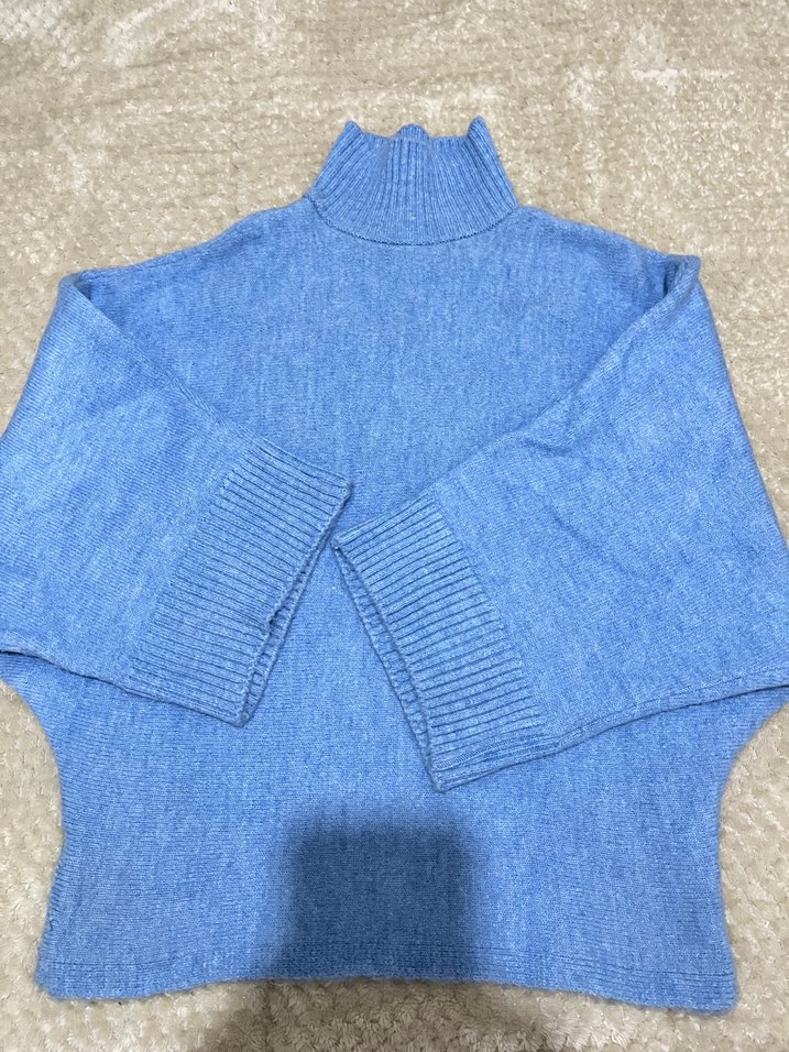 Bu mavi örgü kazak, boğazlı ve uzun kolludur, bol kesimi ve rahat dokusuyla günlük kullanıma uygundur. Pastel tonu ve sade tasarımıyla dikkat çeker.
