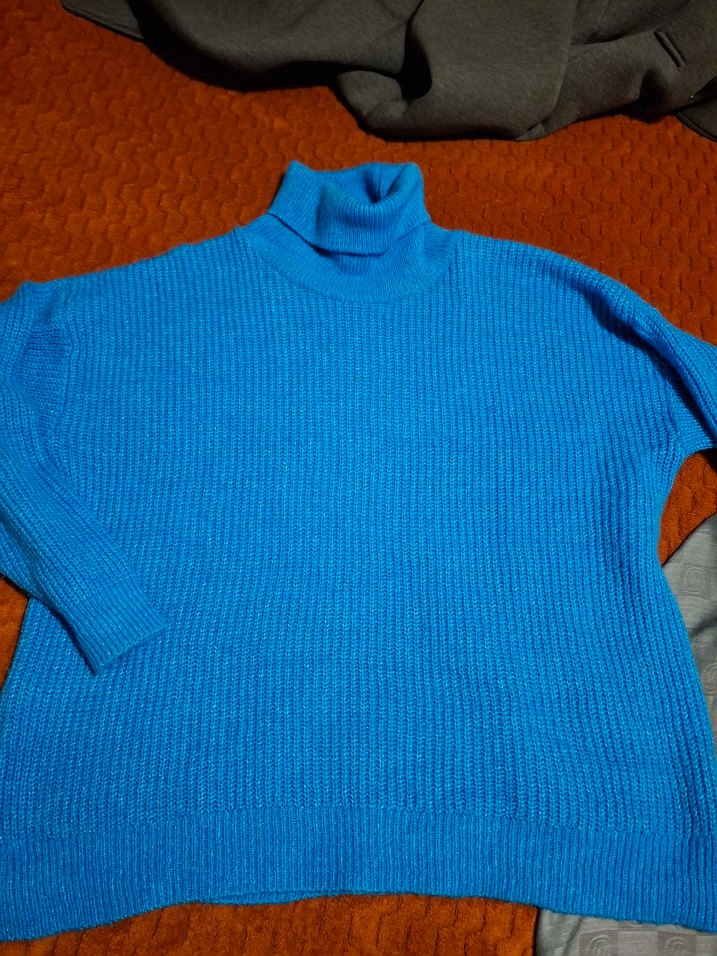 Mavi renkli, boğazlı ve uzun kollu örgü kadın kazak. Rahat ve salaş kesimiyle günlük kullanıma uygun, desen içermeyen midi boyda bir modeldir. bir kez kullanıldı