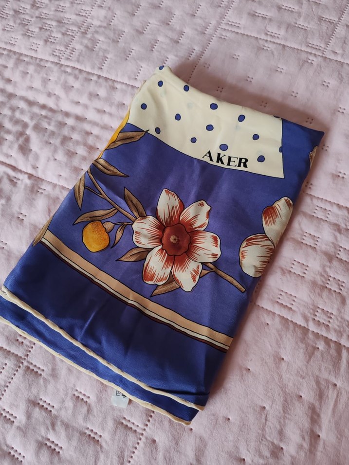 Pastel mavi renkte, çiçek ve puantiye desenli, yumuşak saf ipek kumaştan bohem tarzda drapelenmiş kadın eşarp. Üzerinde 'AKER' markası bulunur. Hiçbir sorunu yoktur birkaç kez kullanıldı.