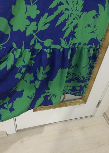 Koyu mavi zemin üzerinde yeşil bağlama desenli yaprak figürleriyle bohem tarzda elbise