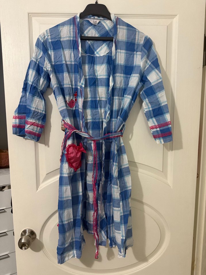Bağlamalı, açık mavi renkli, bohem tarzda ve batik desenli rahat sabahlık