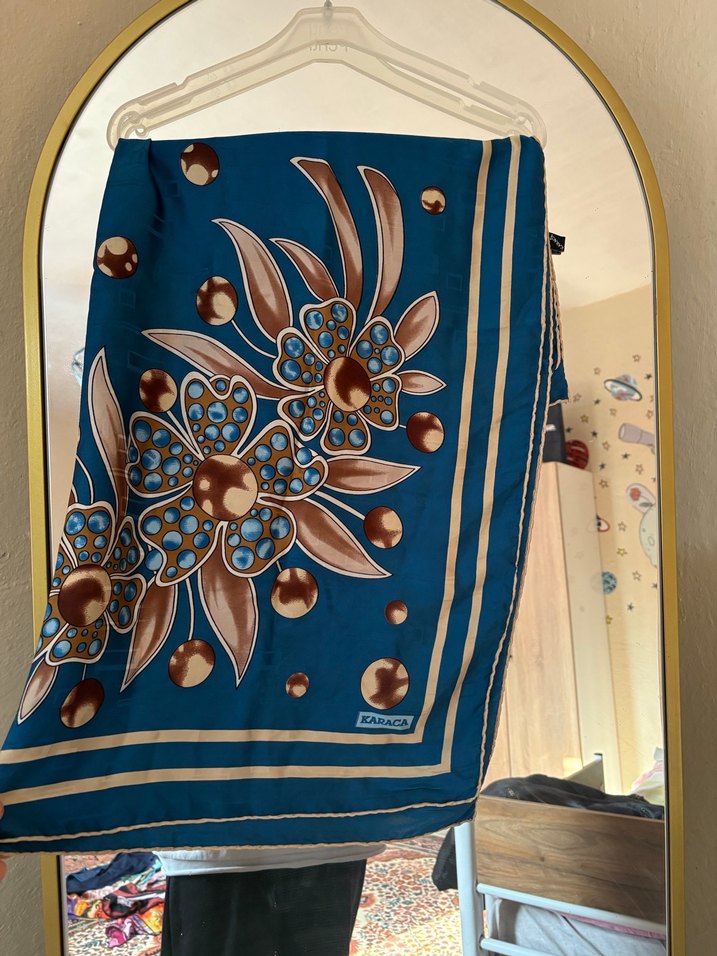 Bu koyu mavi ipek eşarp, bohem tarz için büyük çiçek desenleri ve dökümlü bir yapıya sahiptir.