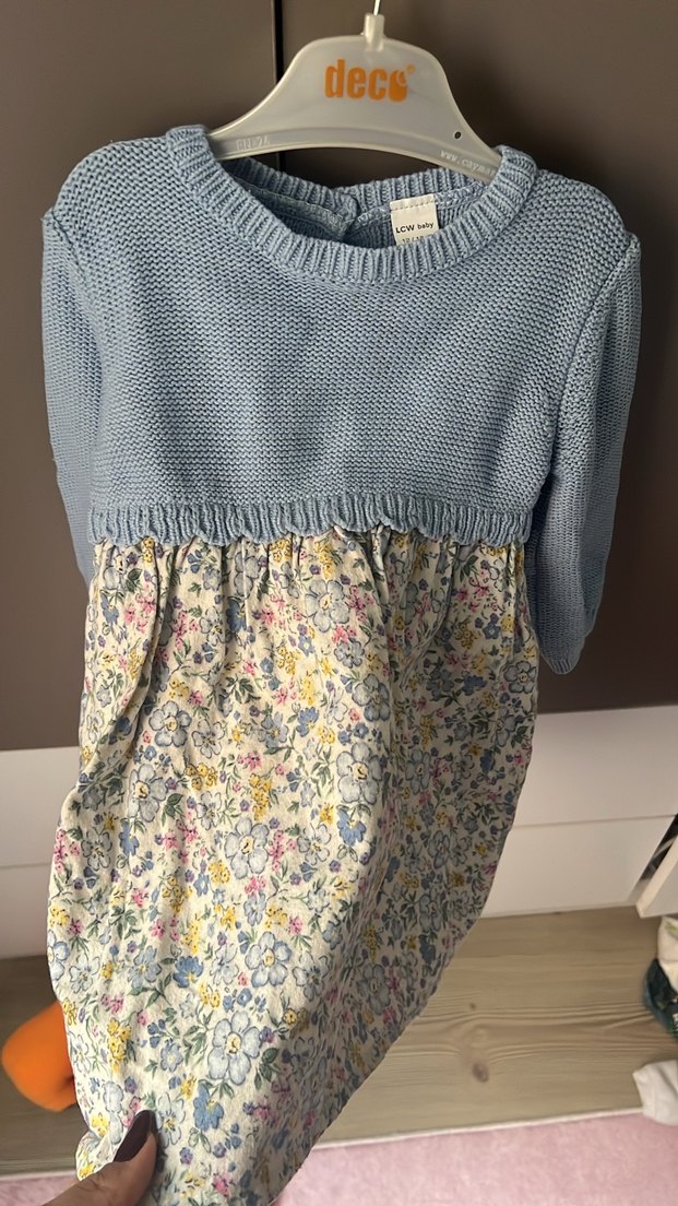 Mavi renkli, uzun kollu ve yuvarlak yakalı triko üst kısmı ile çiçek desenli etek kısmı birleşimi, bohem tarzda kız elbisesi.