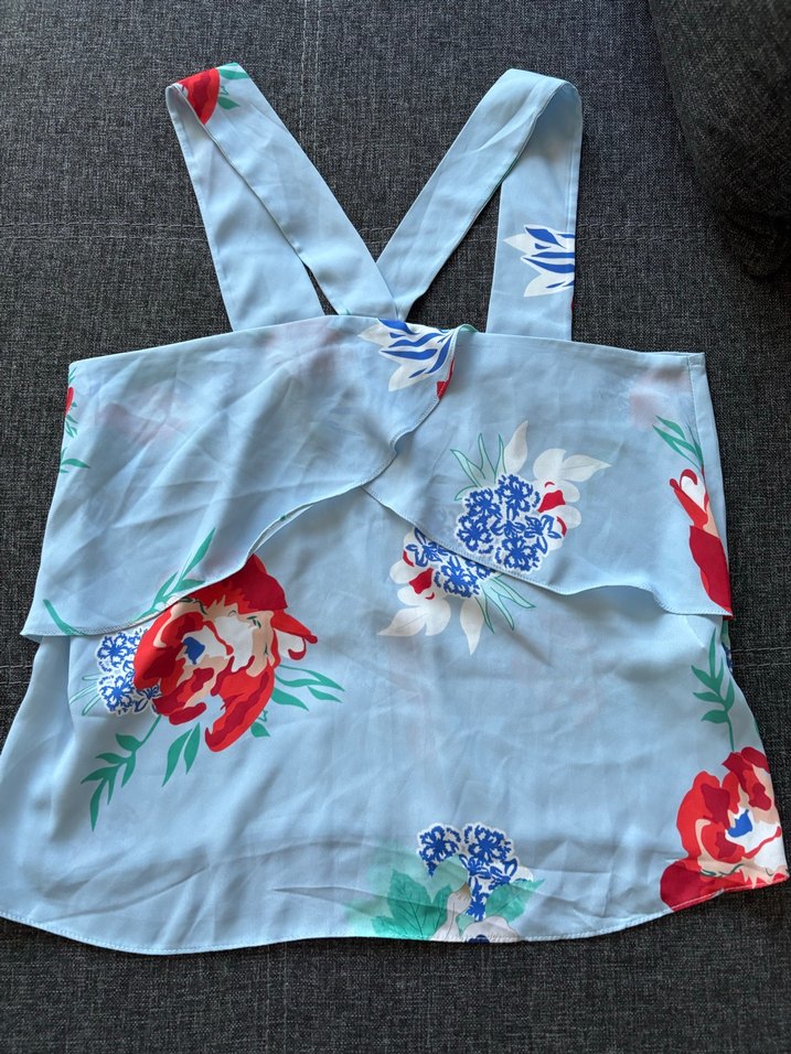Pastel mavi renkli, bol kesim, çiçek desenli ve fırfırlı bluz. Askılı, yumuşak kumaştan, bohem tarz için uygun.