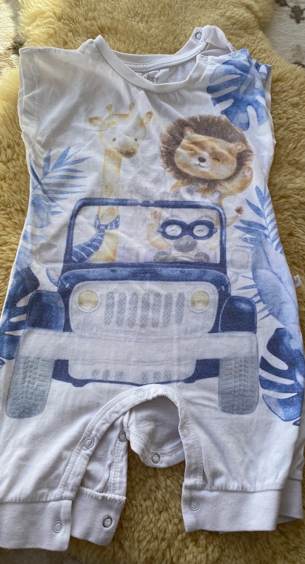 Bohem tarzda, mavi ve gri baskılı, yumuşak kürk detaylı, kolsuz bebek tulumu. Sentetik kumaştan üretilmiştir.