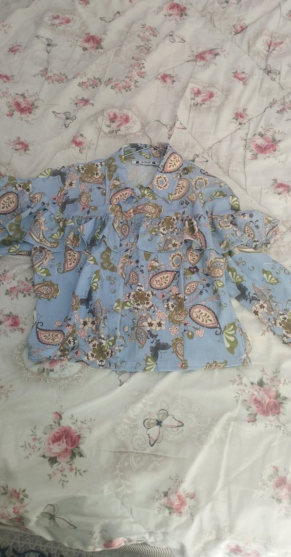 Yumuşak tekstil kumaştan, uzun kollu, yakalı, bol kesim mavi baskılı hamile bluzu. Fırfır detaylarıyla günlük kullanıma uygundur.