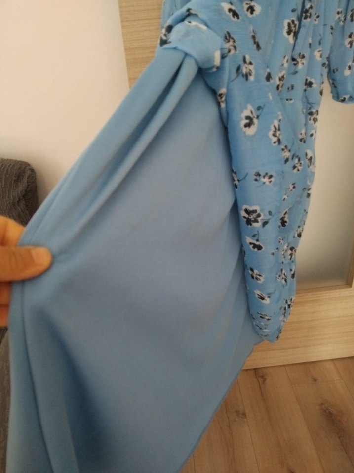 Mavi, bol kesim, V yaka ve askılı kollu hamile bluzu. Uzun boyda, dökümlü ve pastel renkli baskılı desene sahip bohem tarzda.