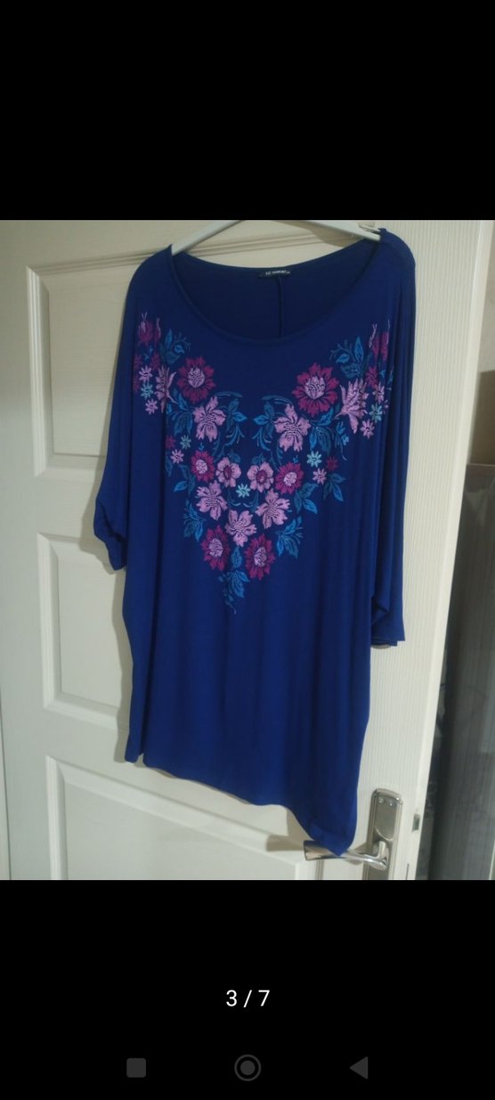 Mavi renkli, bohem desenli, kısa kollu, yuvarlak yakalı, bol kesim ve dökümlü bluz. Günlük kullanım için uygundur.