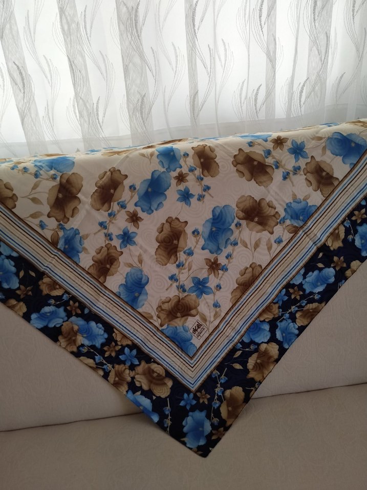 Bu açık mavi eşarp örtüsü, kumaş üzerinde 'aquatic' yazısı bulunan baskılı bohem çiçek desenine sahiptir. yumuşak ve dekoratif bir dokunuş katar.