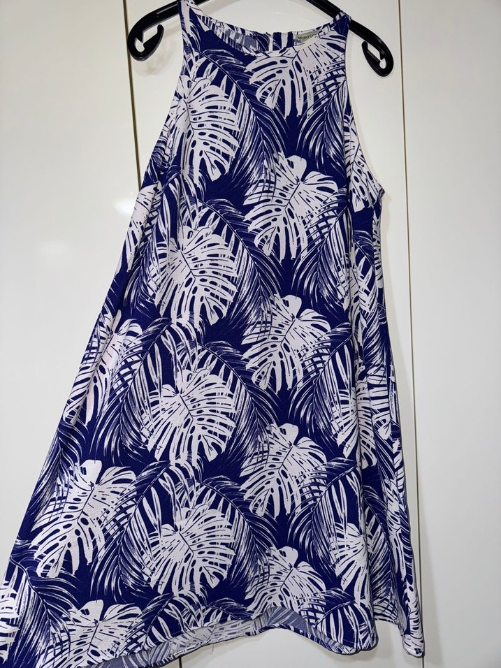 Kolsuz, straplez yaka ve drapeli detaylı midi elbise. Lacivert zemin üzerine beyaz yaprak desenleriyle günlük kullanıma uygun.