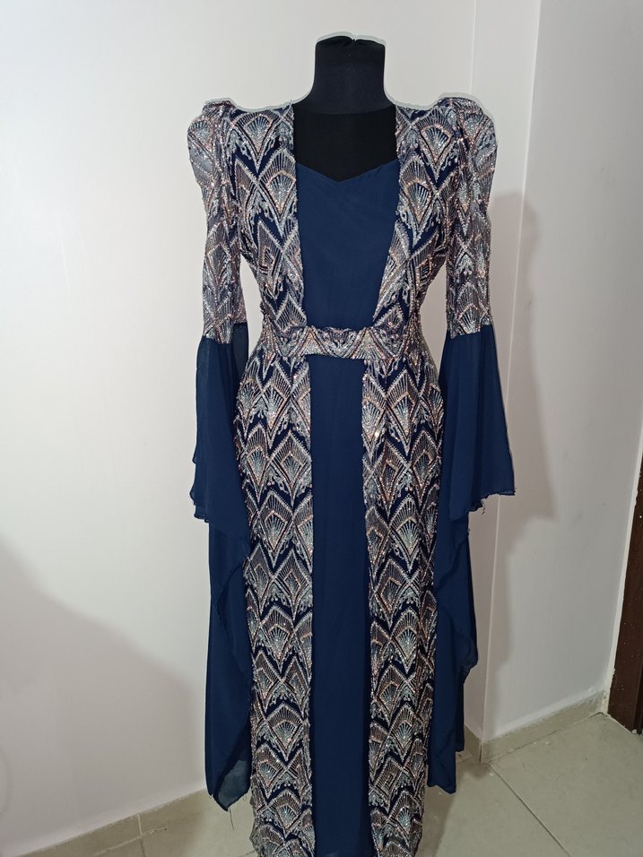 Mavi, drapeli ve notlu yakalı uzun elbise, uzun kollu ve abiye .. 38-42 beden icin uygundur