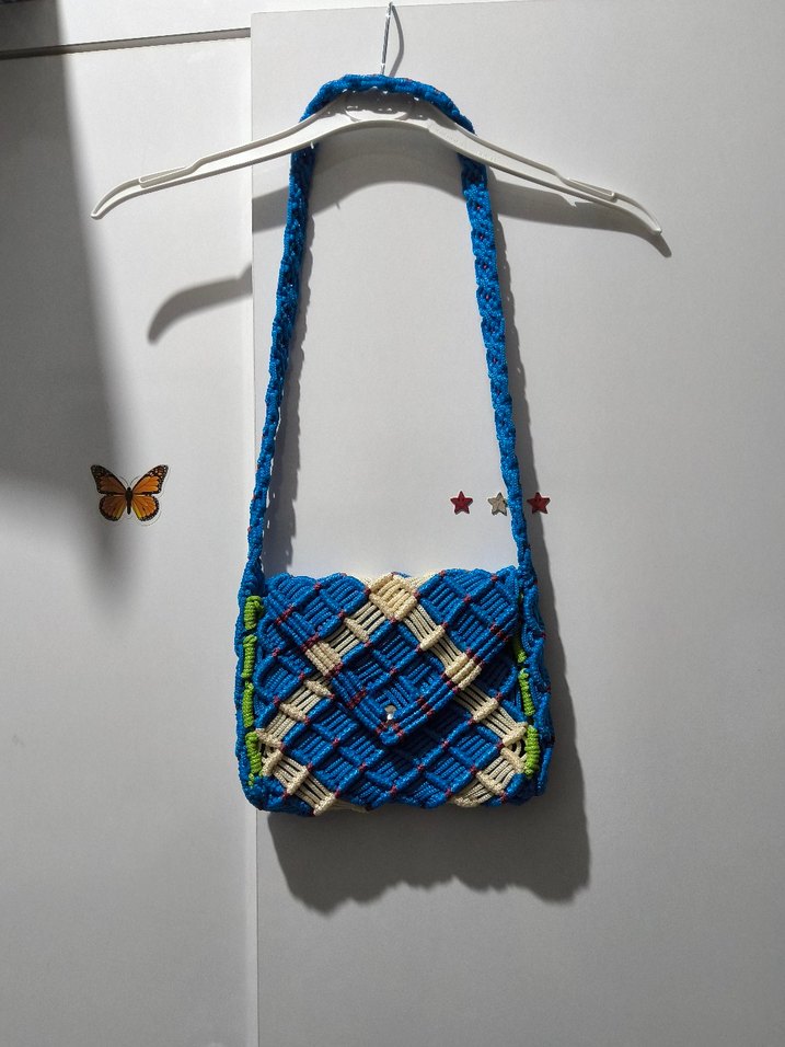 Renkli mavi dokuma omuz çantası, bohem batik desenli ve tokalı kapaklı, günlük kullanım için uygun.