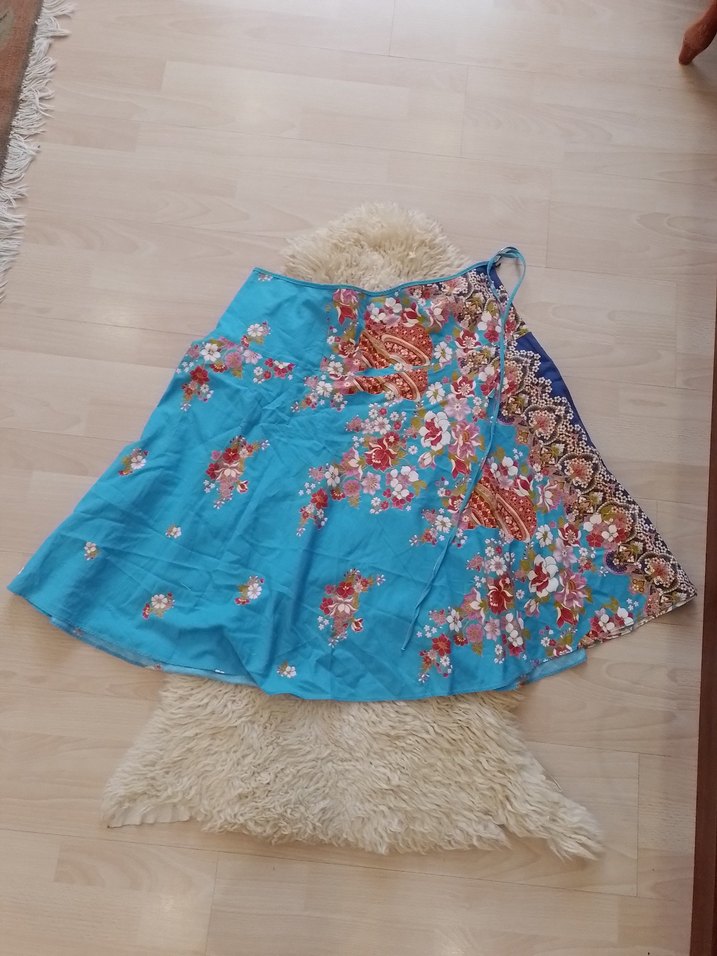 Mavi renkli, drapeli ve gevşek kesimli hamile eteği, tie-dye desenli bohem tarzıyla günlük kullanıma uygundur.