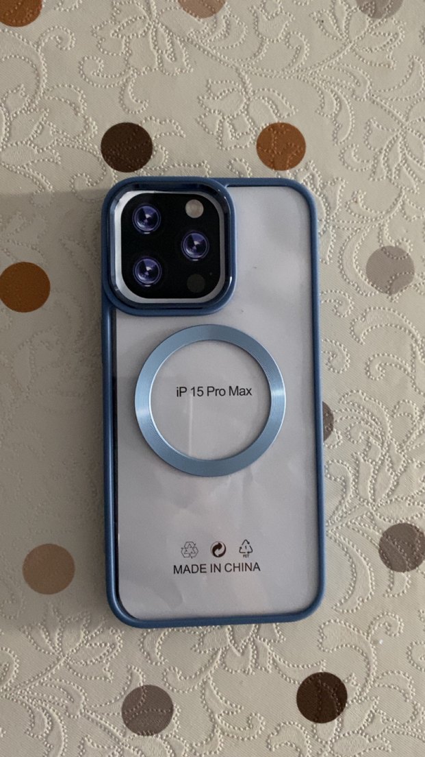 iPhone 15 Pro Max için mavi, düğmeli ve bohem tarzda telefon kılıfı. Gri dairesel halka detayı bulunur. "MADE IN CHINA" ve model bilgisi yazılıdır.