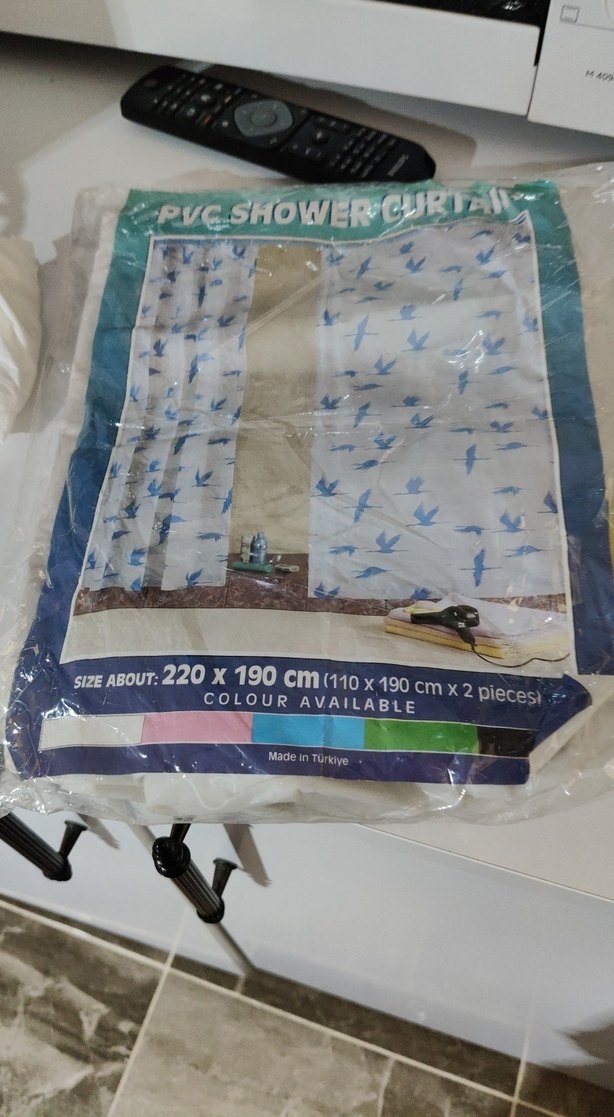 beyaz baskısız ve bohem tarzda duş perdesi. Yaklaşık 220 x 190 cm boyutlarında, iki parçadan oluşur. Türkiye yapımı.