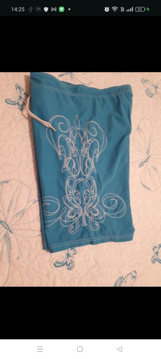 Mavi, parlak görünümlü, baskılı bohem desenli, drapeli ve vücuda oturan erkek mayo şortu, plaj için uygundur. En genişliği 51 cm. Ölçüyü dikkate alın iade kabul edilmez