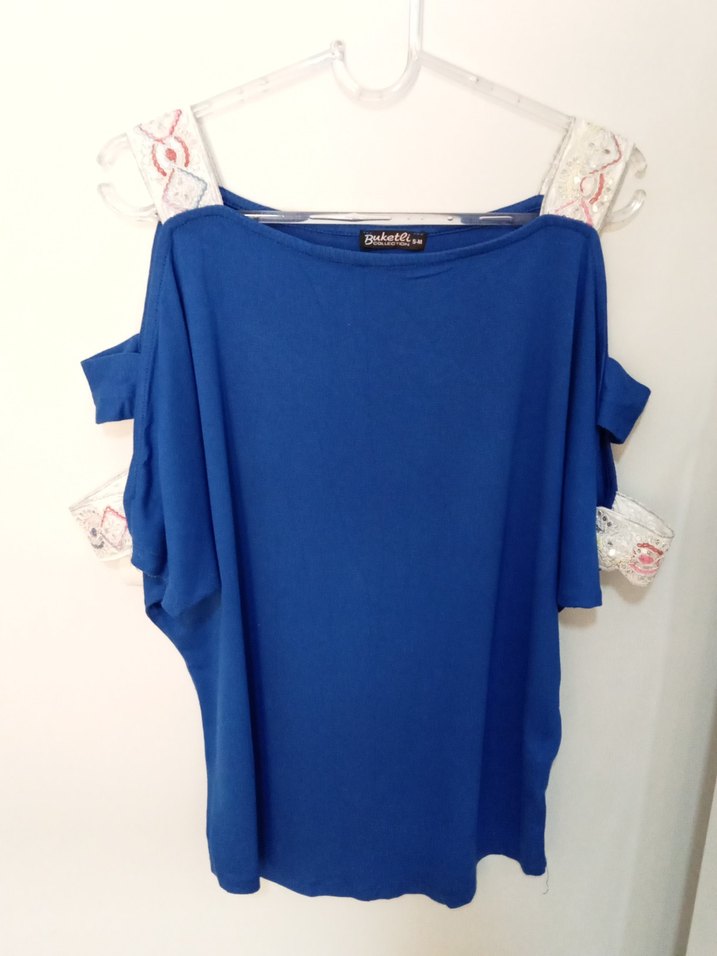 Mavi renkli, kısa kollu ve kayık yaka, bol kesim bohem tarzda kadın bluz bir kaç kez kullanılmıştır
