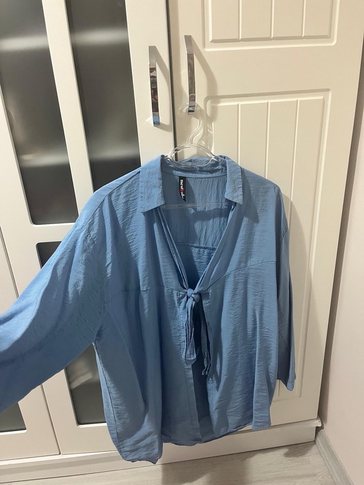 Mavi keten kumaştan, yakalı ve uzun kollu bol kesim gömlek. Düğmeli ve önünde bağcık detayı bulunur. Günlük rahat kullanım için uygundur.