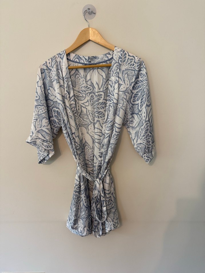 Kısa kollu, V yakalı, kemerli ve bohem bağlama desenli midi uzunlukta rahat kesim kimono. Yumuşak dokulu kumaştan üretilmiştir.