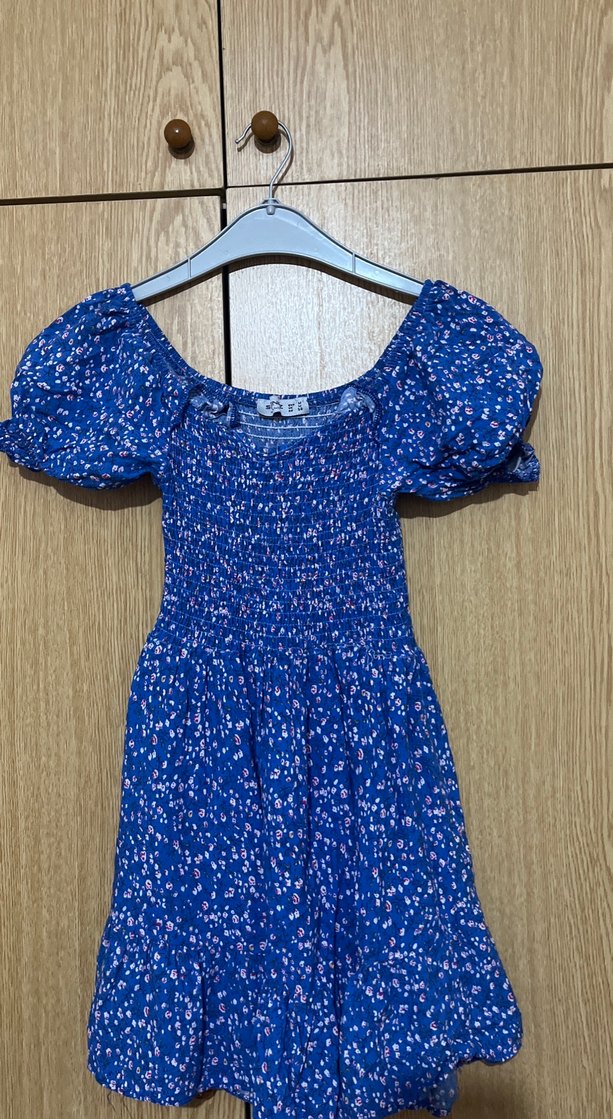 Mavi midi elbise, kısa kabarık kollu ve straplez yakalıdır. Renkli batik deseni ve bol kesimiyle bohem tarzını yansıtır.