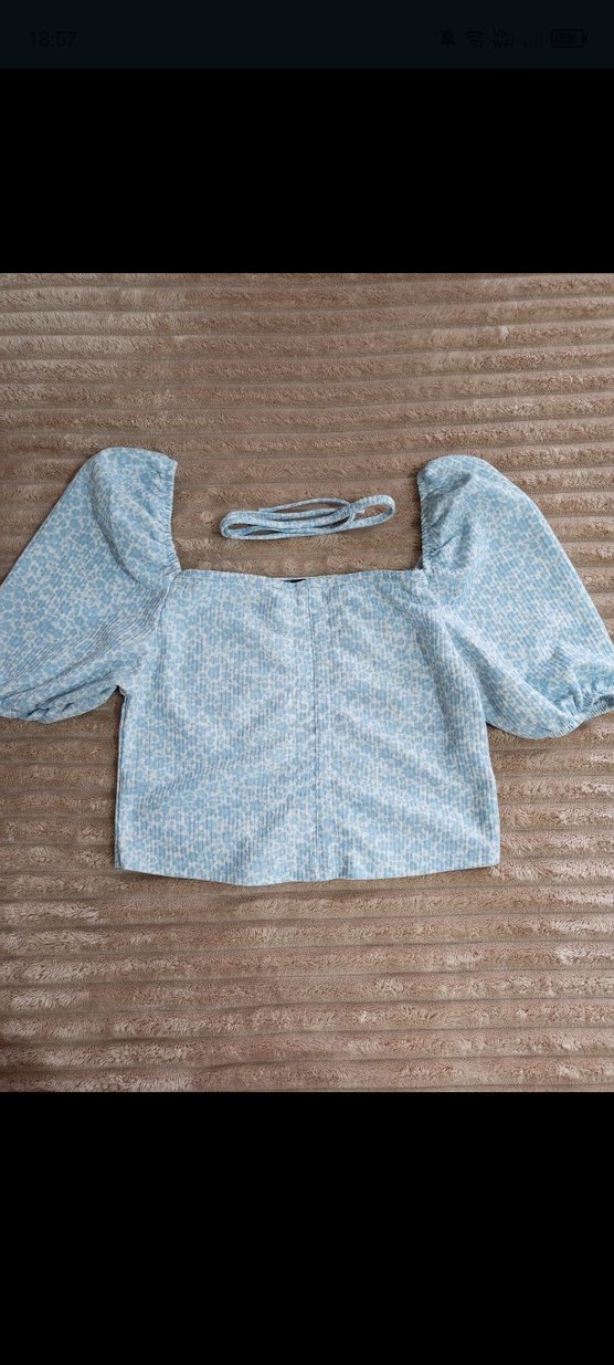 Bohem tarzda, mavi pastel tonlarda, kısa kollu, düğmeli ve salaş kesim mini bluz. Yumuşak sentetik kumaştan, tekne yaka detaylı.