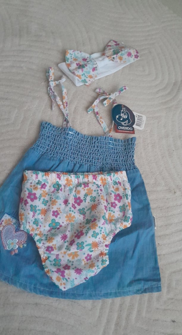 Mavi renkte, bohem tarzda kız çocuk elbisesi. Askılı, straplez yakalı, bol kesim ve çiçek desenli. Fırfırlı detaylı, saç bandı ile birlikte.