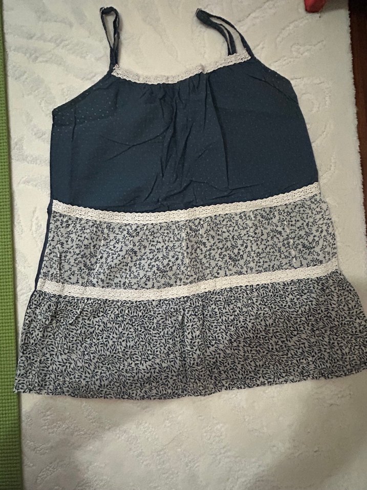 için bohem tarzda, kolsuz, straplez yaka ve fırfırlı, bol kesim mavi ve desenli gri kumaştan yapılmıştır.