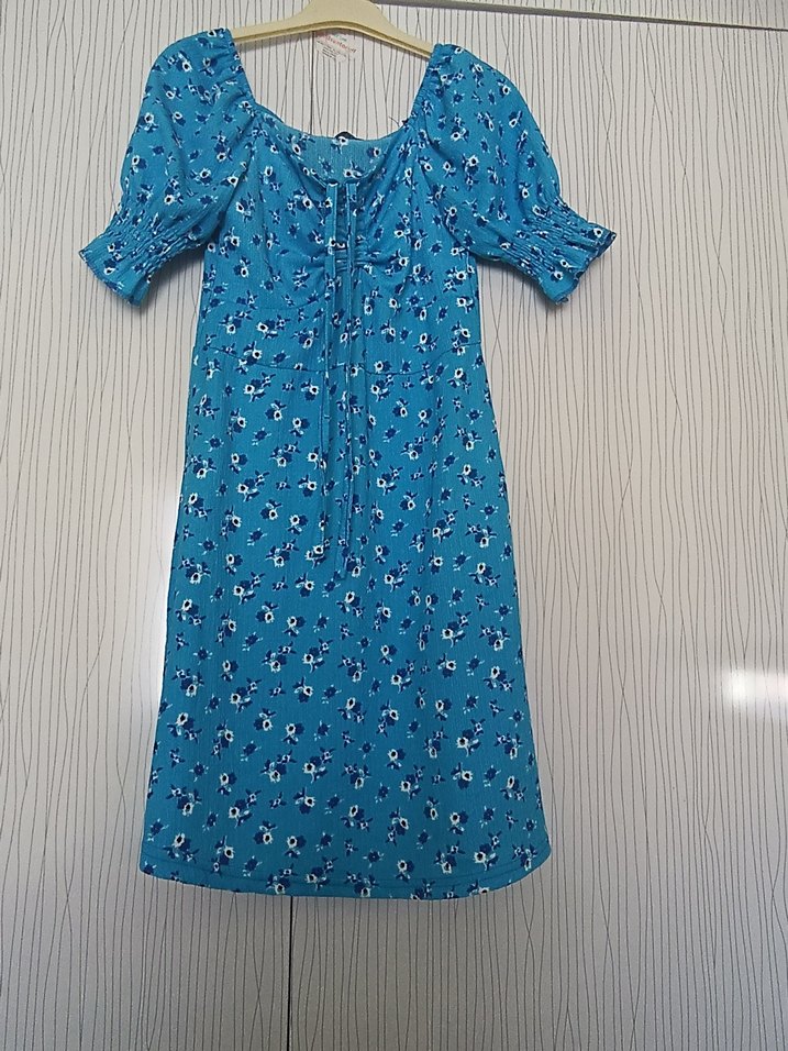 Mavi bohem elbise, tekne yaka, kısa kollu Renkli batik desenli, midi boy ve rahat kesimdir.