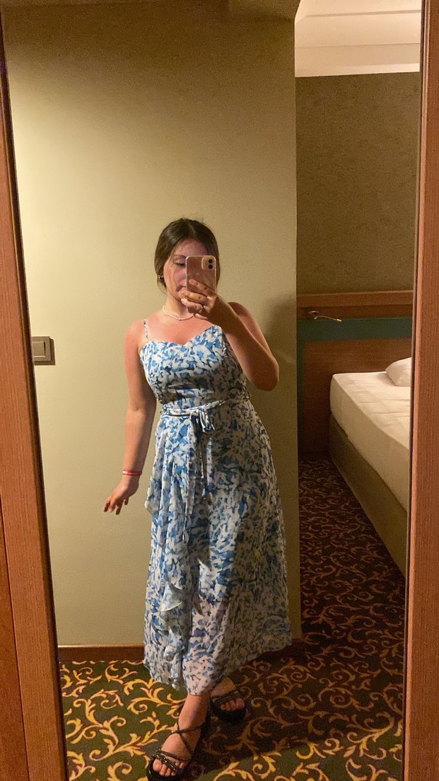 Hafif mavi renkli, askısız, midi uzunlukta, bol kesim ve batik desenli elbise. Sentetik kumaştan, transparan ve kolsuz tasarıma sahip, bohem tarzda düğünler için uygun.