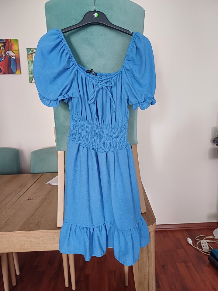 Yeni bir veya iki defa kullanıldı..Omuzdan Boyu 90 cm.iki kolarası 46cm...Traples belden lastikli bol kesim mavi mini elbise, kabarık kollar ve fırfır detaylarıyla bohem tarzını yansıtıyor, askısız yakaya sahip. huzurla mutlulukla güle güle kullanın..
