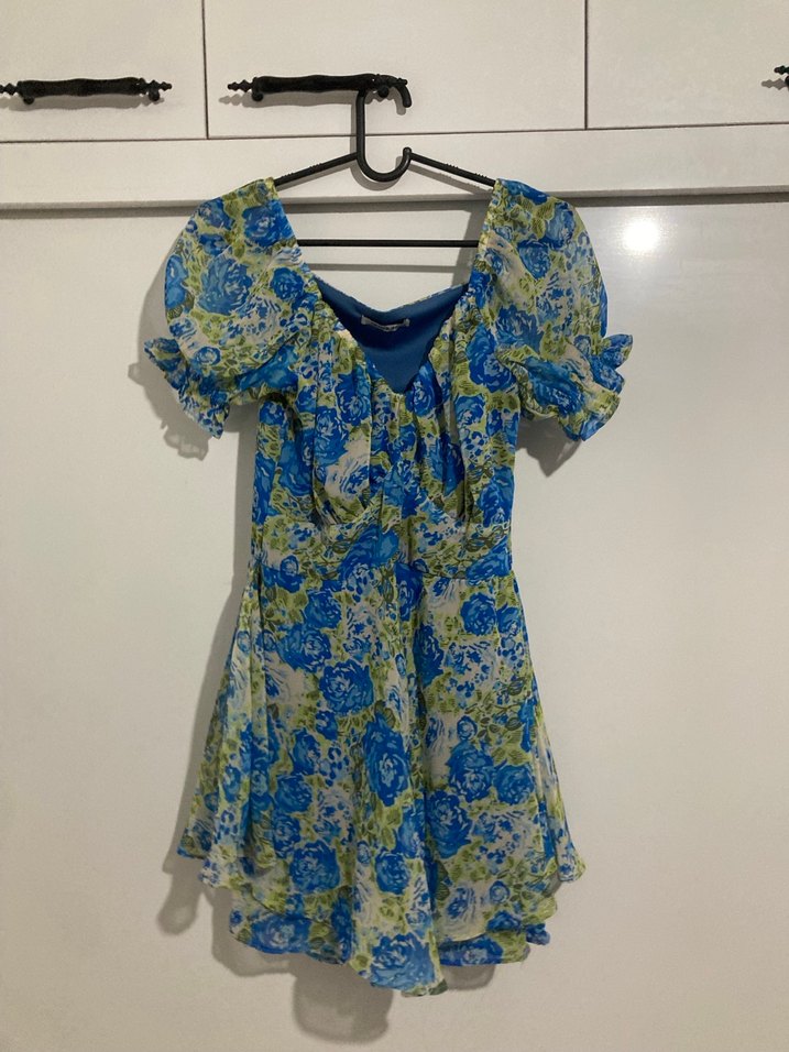 Mavi pastel tie-dye desenli, kısa kollu, fırfırlı ve V yakalı bol kesim mini elbise. Yumuşak sentetik kumaştan, günlük kullanıma uygun. Hiç giyilmedi iç astarı vardır
