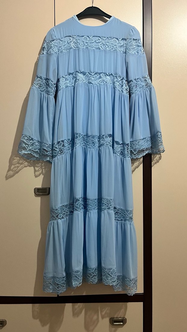 Mavi bohem uzun elbise, fırfır ve nakış detaylarına sahiptir. Straplez yaka, askılı kol ve bol kesim ile yumuşak sentetik kumaştan yapılmıştır. Düğünler için uygundur.