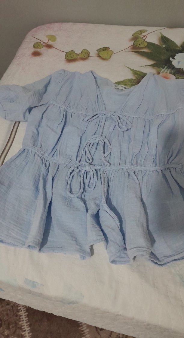 Yumuşak keten kumaştan, bol kesim, lastikli ve ortaa boy kollu pastel mavi üst Günlük kullanıma uygun, bohem tarzda.