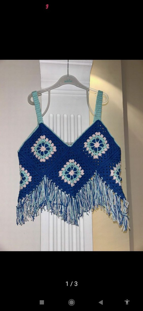 V yaka, askılı, mavi örgü crop top. Bağlama desenli ve püsküllü, bol kesim. Günlük kullanıma uygun.