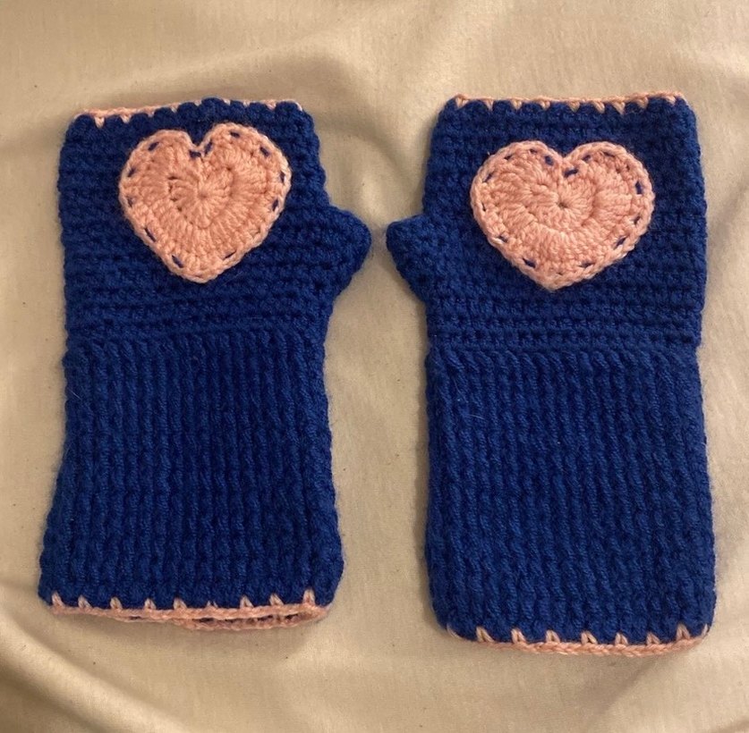 Mavi renkli, örgü kadın eldivenleri pembe kalp detaylarıyla bohem ve renkli bir tarz sunar. Rahat ve retro görünüme uygundur.