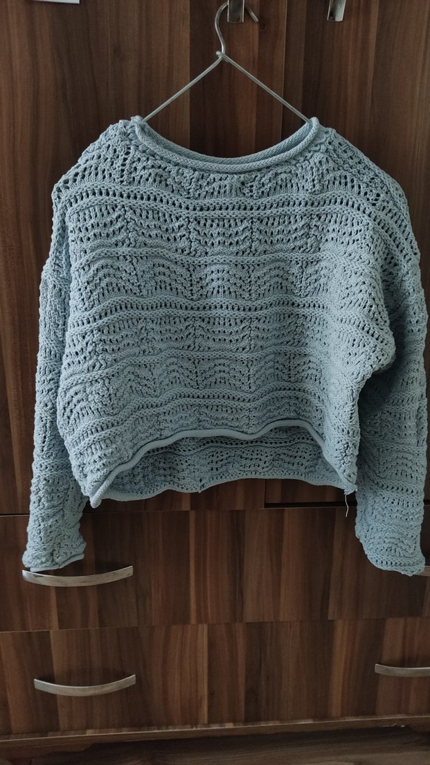 mavi renkte, bohem tarzda, uzun kollu, yuvarlak yaka, bol kesim örgü kadın kazak. Rahat ve günlük kullanım için uygundur.