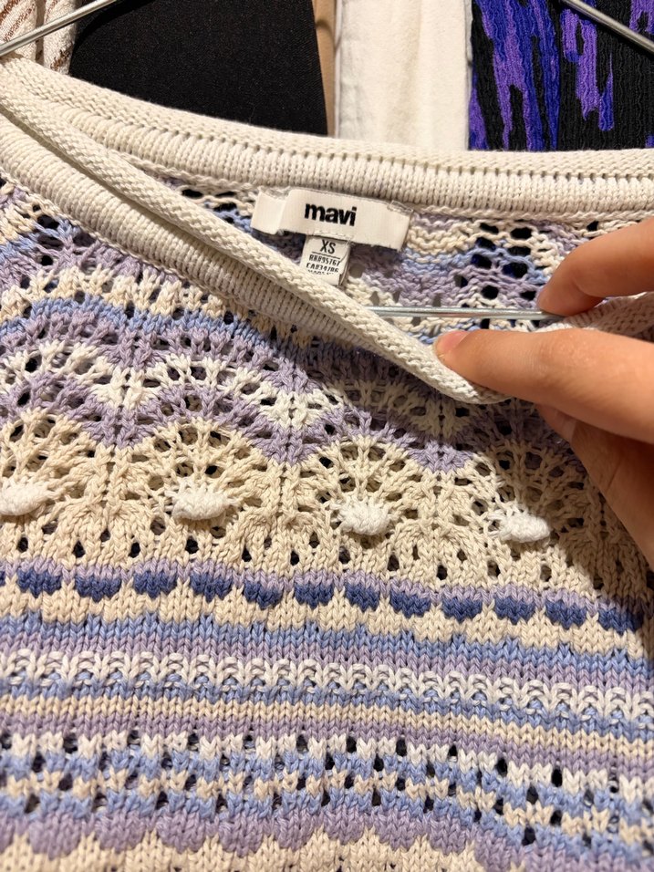 Mavi marka omuzdan boyu 45 cm Pastel çok renkli batik desenli, bohem tarzda, uzun kollu, örgü, normal boyda, fitted kesim kadın kazak.